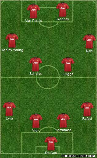 De Gea · Vidic · Ferdinand · Rafael · Evra · Giggs · Scholes · Nani · Ashley Young · Van Persie · Rooney