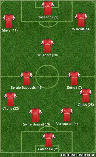 Fabianski (21) · Rio Ferdinand (33) · Vermaelen (4) · Clichy (22) · Gibbs (25) · Sergio Busquets (45) · Song (17) · Wilshere (10) · Ribery (11) · Walcott (14) · Cassano (99)