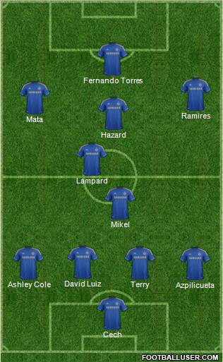 Cech · Azpilicueta · Ashley Cole · Terry · David Luiz · Mikel · Lampard · Hazard · Mata · Ramires · Fernando Torres