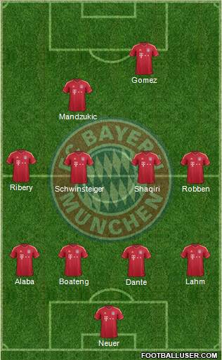 Neuer · Dante · Alaba · Boateng · Lahm · Schwinsteiger · Shaqiri · Robben · Ribery · Mandzukic · Gomez