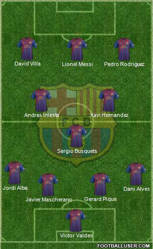 Victor Valdes · Javier Mascherano · Gerard Pique · Dani Alves · Jordi Alba · Sergio Busquets · Andres Iniesta · Xavi Hernandez · Lionel Messi · Pedro Rodriguez · David Villa