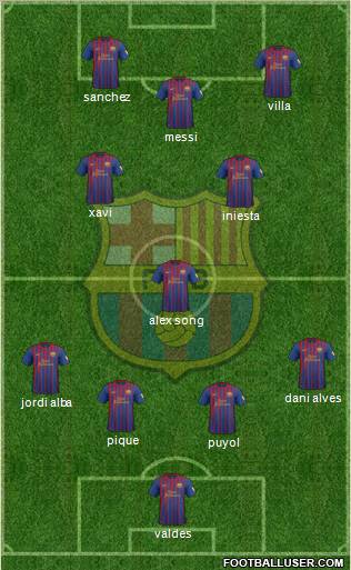 valdes · puyol · pique · jordi alba · dani alves · alex song · iniesta · xavi · messi · villa · sanchez