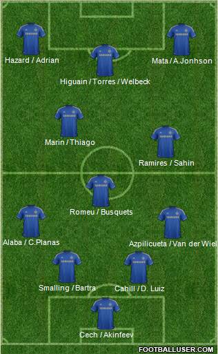 Cech / Akinfeev · Cahill / D. Luiz · Smalling / Bartra · Azpilicueta / Van der Wiel · Alaba / C.Planas · Romeu / Busquets · Ramires / Sahin · Marin / Thiago · Higuain / Torres / Welbeck · Mata / A.Jonhson · Hazard / Adrian