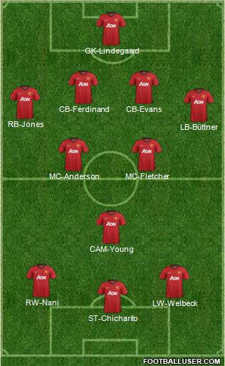 GK-Lindegaard · CB-Ferdinand · CB-Evans · RB-Jones · LB-Büttner · MC-Anderson · MC-Fletcher · CAM-Young · RW-Nani · LW-Welbeck · ST-Chicharito