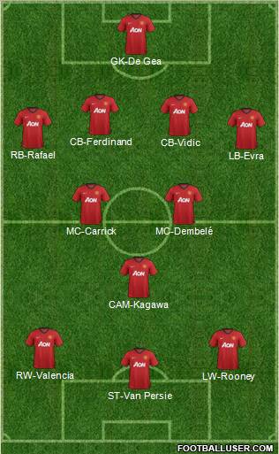 GK-De Gea · CB-Ferdinand · CB-Vidic · RB-Rafael · LB-Evra · MC-Carrick · MC-Dembelé · CAM-Kagawa · RW-Valencia · LW-Rooney · ST-Van PersieEPL team (full fit team)