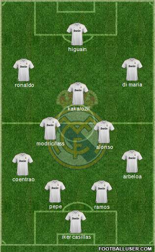 iker casillas · ramos · pepe · coentrao · arbeloa · alonso · modric/lass · kaka/ozil · ronaldo · di maria · higuain
