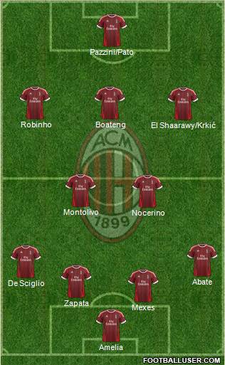 Amelia · Mexes · Zapata · De Sciglio · Abate · Nocerino · Montolivo · El Shaarawy/Krkić · Robinho · Boateng · Pazzini/Pato