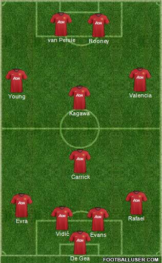 De Gea · Evans · Vidić · Evra · Rafael · Carrick · Kagawa · Young · Valencia · Rooney · van Persie