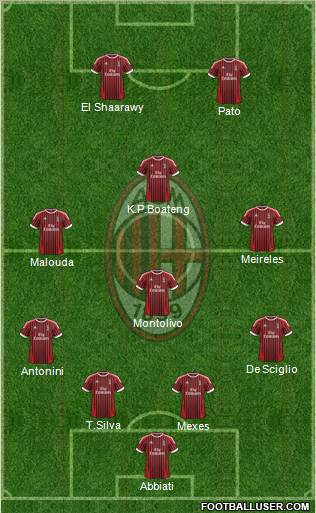 Abbiati · Mexes · T.Silva · Antonini · De Sciglio · Montolivo · Malouda · Meireles · K.P.Boateng · Pato · El Shaarawy