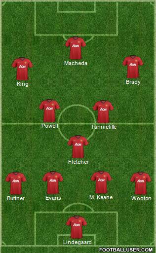 Lindegaard · Buttner · Wooton · Evans · M. Keane · Fletcher · Tunnicliffe · Powell · King · Brady · Macheda