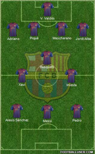 Messi · Pedro · Alexis Sánchez · Iniesta · Xavi · Busquets · Adriano · Jordi Alba · Piqué · Mascherano · V. Valdés
