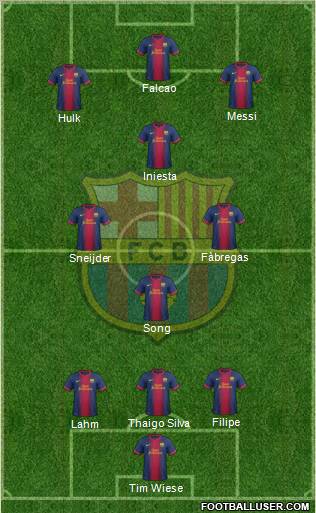 Tim Wiese · Lahm · Thaigo Silva · Filipe · Song · Sneijder · Fàbregas · Iniesta · Hulk · Messi · Falcao