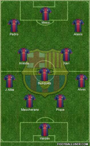 Valdés · Mascherano · Pique · J Alba · Alves · Busquets · Iniesta · Xavi · Pedro · Alexis · Messi