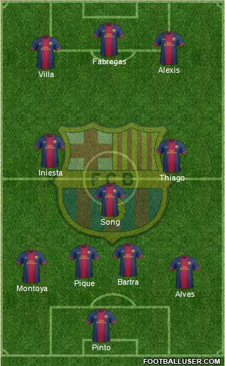 Pinto · Alves · Montoya · Pique · Bartra · Song · Thiago · Iniesta · Villa · Alexis · Fabregas