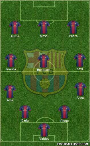Valdes · Pique · Barta · Alba · Alves · Busquets · Iniesta · Xavi · Alexis · Messi · Pedro