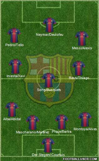 Der Stegen/ Courtuis · Mascherano/Martinez · Pique/Bartra · Montoya/Alves · Alba/Abidal · Song/Busquets · Reus/Thiago · Iniesta/Xavi · Messi/Alexis · Pedro/Tello · Neymar/Deulofeu