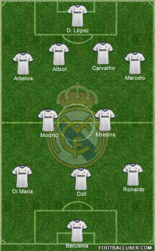 Benzema · Ozil · Di Maria · Ronaldo · Modric · Khedira · Arbeloa · Marcelo · Albiol · Carvalho · D. López