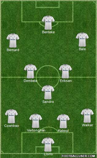Lloris · Kaboul · Vertonghen · Coentrao · Walker · Sandro · Dembele · Eriksen · Bernard · Bale · Benteke