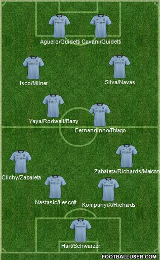 Hart/Schwarzer · Kompany/X/Richards · Nastasic/Lescott · Clichy/Zabaleta · Zabaleta/Richards/Maicon · Fernandinho/Thiago · Yaya/Rodwell/Barry · Isco/Milner · Silva/Navas · Aguero/Guidetti · Cavani/Guidetti