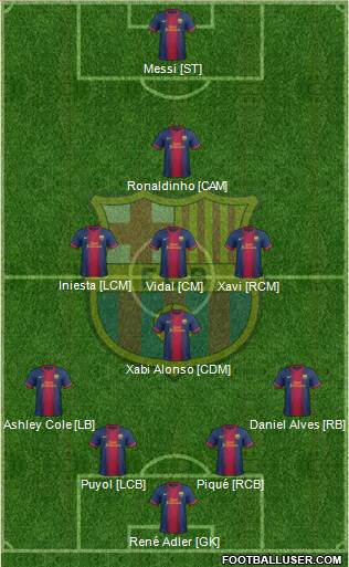 René Adler [GK] · Puyol [LCB] · Piqué [RCB] · Ashley Cole [LB] · Daniel Alves [RB] · Xabi Alonso [CDM] · Vidal [CM] · Xavi [RCM] · Iniesta [LCM] · Ronaldinho [CAM] · Messi [ST]Valdés [GK]