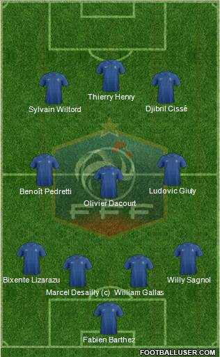 Fabien Barthez · Marcel Desailly (c) · William Gallas · Bixente Lizarazu · Willy Sagnol · Olivier Dacourt · Benoît Pedretti · Ludovic Giuly · Sylvain Wiltord · Djibril Cissé · Thierry HenryFrance - "Confederations Cup Champion" XI (2003)