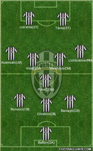Buffon(GK) · Chiellini(CB) · Barzagli(CB) · Bonucci(CB) · Pirlo(CDM) · Vidal(CM) · Marchisio(CM) · Asamoah(LM) · Lichtsteiner(RM) · Tévez(ST) · Llorente(ST)