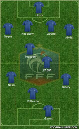 Giroud · Valbuena · Ribery · Nasri · Pogba · Toulalan · Abidal · Sagna · Koscielny · Varane · Lloris