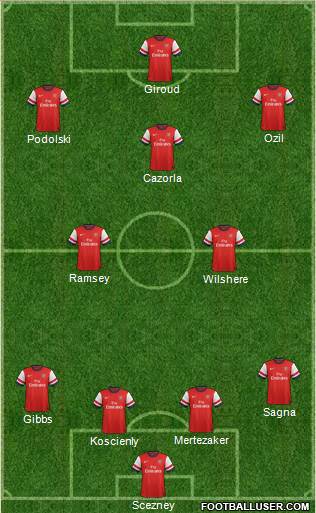 Scezney · Koscienly · Mertezaker · Gibbs · Sagna · Wilshere · Ramsey · Cazorla · Podolski · Ozil · Giroud