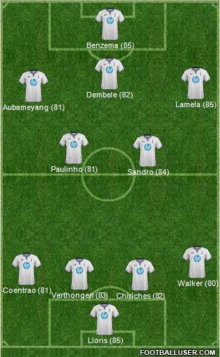 Lloris (85) · Chiriches (82) · Verthongen (83) · Coentrao (81) · Walker (80) · Sandro (84) · Paulinho (81) · Aubameyang (81) · Lamela (85) · Dembele (82) · Benzema (85)