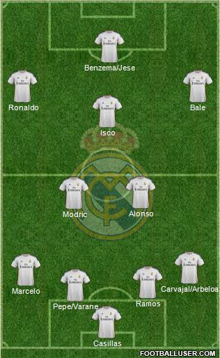 Casillas · Pepe/Varane · Ramos · Marcelo · Carvajal/Arbeloa · Modric · Alonso · Isco · Ronaldo · Bale · Benzema/JeseBecause I think that formation is the best for Real Madrid C.F.Because these players is the best.