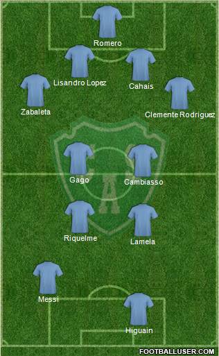 Romero · Lisandro Lopez · Cahais · Zabaleta · Clemente Rodriguez · Gago · Cambiasso · Riquelme · Lamela · Messi · Higuain
