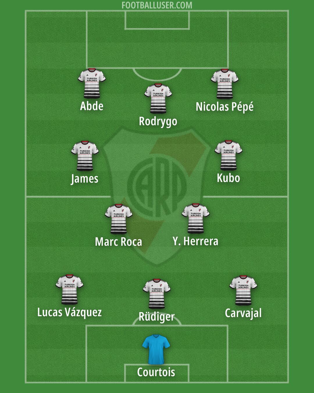Augusto Batalla (Rayo Vallecano) · Montiel (River) · M. Quarta (River) · Facu Medina (O. Marseille) · Pezzella (River) · Enzo Fernandez (Chelsea) · Echeverri (M. City) · Mastantuono (Real Madrid) · Julian Alvarez (Atleti) · Exequiel Palacios (Leverkusen) · Giuliano Simeone (Atleti)