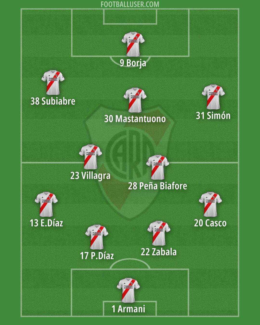 1 Armani · 4 Montiel · 6 Pezzella · 17 Díaz · 21 Acuña · 28 Martínez Quarta · 34 Galoppo · 31 Simón · 8 Meza · 11 Colidio · 9 Borja