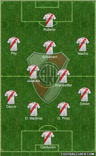 Armani / Ledesma (Beltrán / Lavagnino) · Sant'Anna / (Casco) · Boselli / Gattoni (Pires / Zabala) · Paulo (V. Gómez / Funes Mori) · Enzo Díaz / (Carboni) · Peña Biafore / Villagra (Kranevitter / Fonseca) · Lanzini / (Nacho) · Simón / (Aliendro) · Mastantuono / (Echeverri) · Colidio (Solari / Subiabre) · Borja (Bareiro / Ruberto)