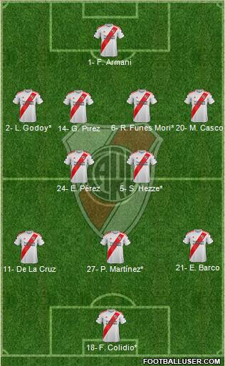 1- F. Armani · 9- M. Borja · 13- E. Díaz · 6- G. Pezzella* · 15- V. Gómez* · 23- R. Villagra · 11- F. Colidio · 7- M. Ojeda* · 26- Nacho F. · 29- G. Montiel* · 29- R. Aliendro