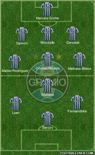 Marcelo Grohe · Geromel · Rhodolfo · Pará · Saimon · Ramiro · Riveros · Giuliano · Dudu · Alan Ruiz · Barcos