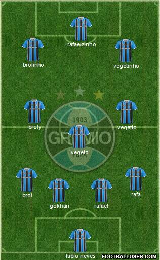 1- Vanderlei · 3- P. Geromel · 4- W. Kannemann · 12- B. Cortez · 2- V. Ferraz · 5- Wallace* · 8- M. Henrique · 11- Pepê · 7- Douglas Costa* · 10- J. Pyerre · 9- D. Souza