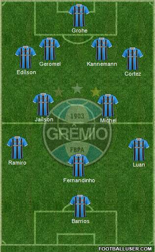 Grohe · Kannemann · Bressan · Léo Moura · Cortez · Arthur · Jailson · Luan · Everton · Ramiro · Jael