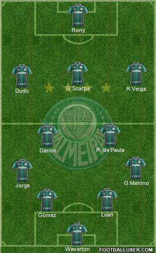 21- Weverton · 2- M. Rocha · 15- G. Gómez · 26- Murilo · 22- J. Piquerez · 8- Zé Rafael · 28- Danilo · 7- Dudu · 23- R. Veiga · 16- Endrick · 10- Rony