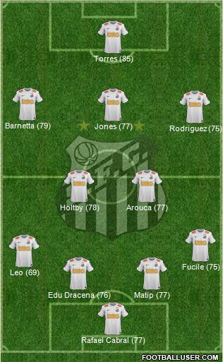 Rafael 1 · Edu D. 2 · Durval 6 · Guilherme 3 · Bruno Peres 4 · Arouca 5 · Cicero 8 · Montillo 10 · Pato Rodrigues 7 · Neymar Jr. 11 · André 9