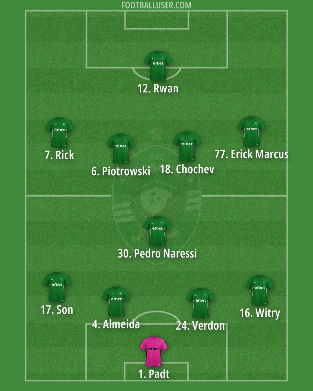 1. Padt · 16. Witry · 24. Verdon · 4. Almeida · 17. Son · 30. Pedro Naressi · 77. Erick Marcus (75' Camara) · 18. Chochev (93' Yordanov) · 6. Piotrowski · 7. Rick (82' Delev) · 12. Rwan (75' Duah)