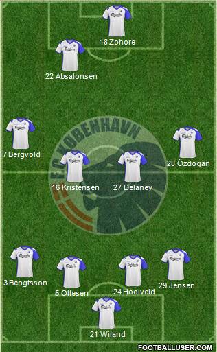 21 Wiland · 1 Christensen · 5 Ottesen · 17 Wendt · 24 Hooiveld · 15 Antonsson · 25 Zanka · 2 Pospech · 3 Bengtsson · 27 Delaney · 29 Jensen · 30 Bolaños · 8 Kvist · 16 Kristensen · 6 Claudemir · 10 Grønkjær · 7 Bergvold · 22 Absalonsen · 20 Vingaard · 28 Özdogan · 14 N'Doye · 18 Zohore · 11 Santin