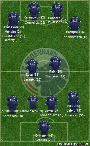 Karamoko (22) · Babacar (28) · Oskarsson (17) · Cornelius (28) · Claesson (29) · Mukairu (21) · Bardghji (16) · Haraldsson (18) · Johannesson (18) · Daramy (19) · Falk (29) · Zeca (33) · Stamenic (19) · Lerager (28) · Diks (25) · Jelert (18) · Kristiansen (18) · Vavro (25) · Boilesen (29) · Khocholava (28) · Ankersen (31) · Sorensen (29), ...