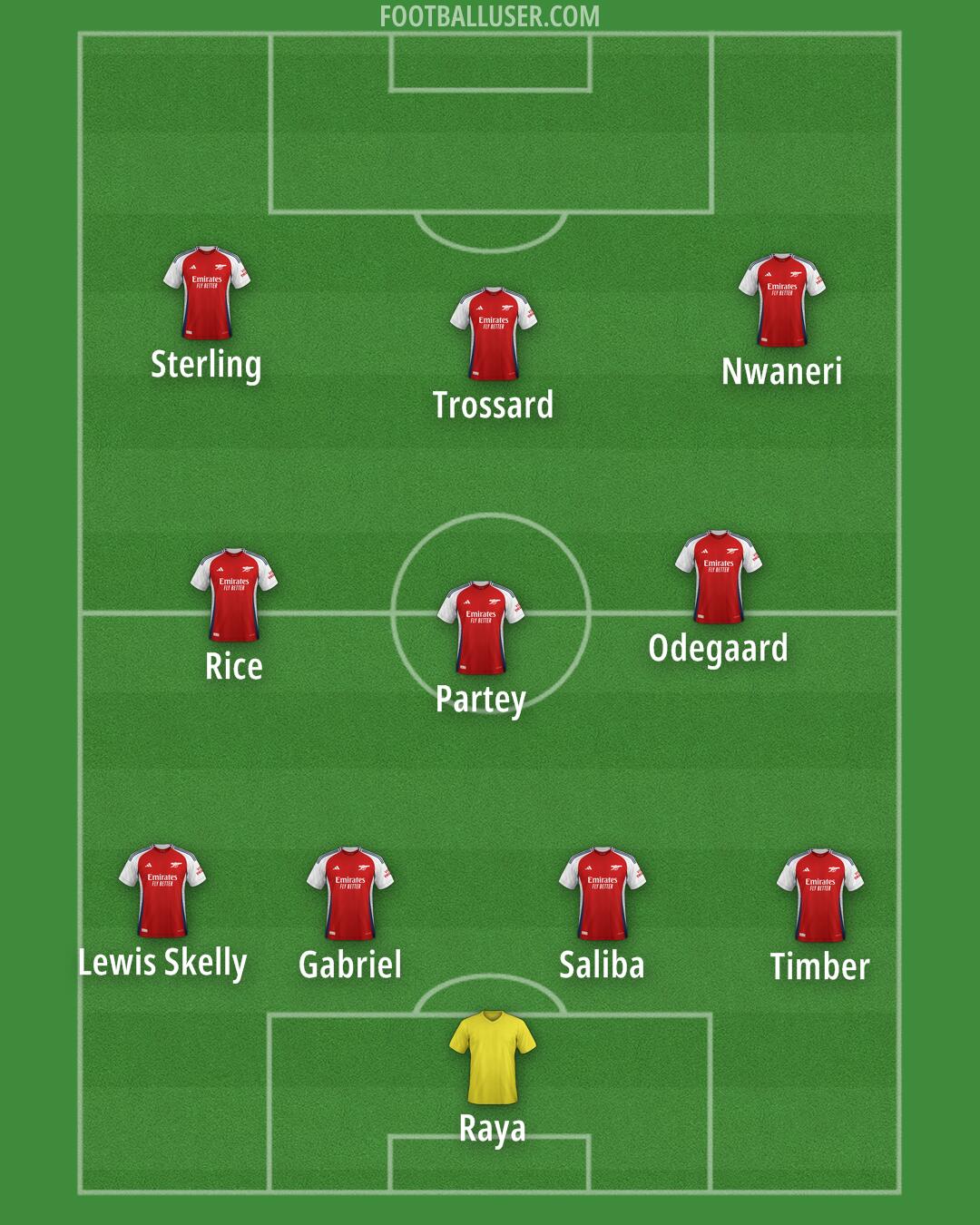 Raya · Saliba · Gabriel · Timber · Calafiori · Zubimendi · Eze · Ødegaard · Gyökeres · Saka · Martinelli