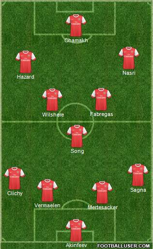 Wojciech Szczęsny · Thomas Vermaelen · Laurent Koscielny · Bacary Sagna · Gael Clichy · Cesc Fabregas · Samir Nasri · Jack Wilshere · Theo Walcott · Robin Van Persie · Marouane Chamakh