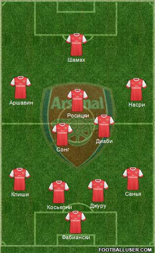 Wojciech Szczęsny · Gaël Clichy · Bacary Sagna · Thomas Vermaelen · Laurent Koscielny · Alexandre Song · Cesc Fàbregas · Jack Wilshere · Samir Nasri · Marouane Chamakh · Robin van Persie