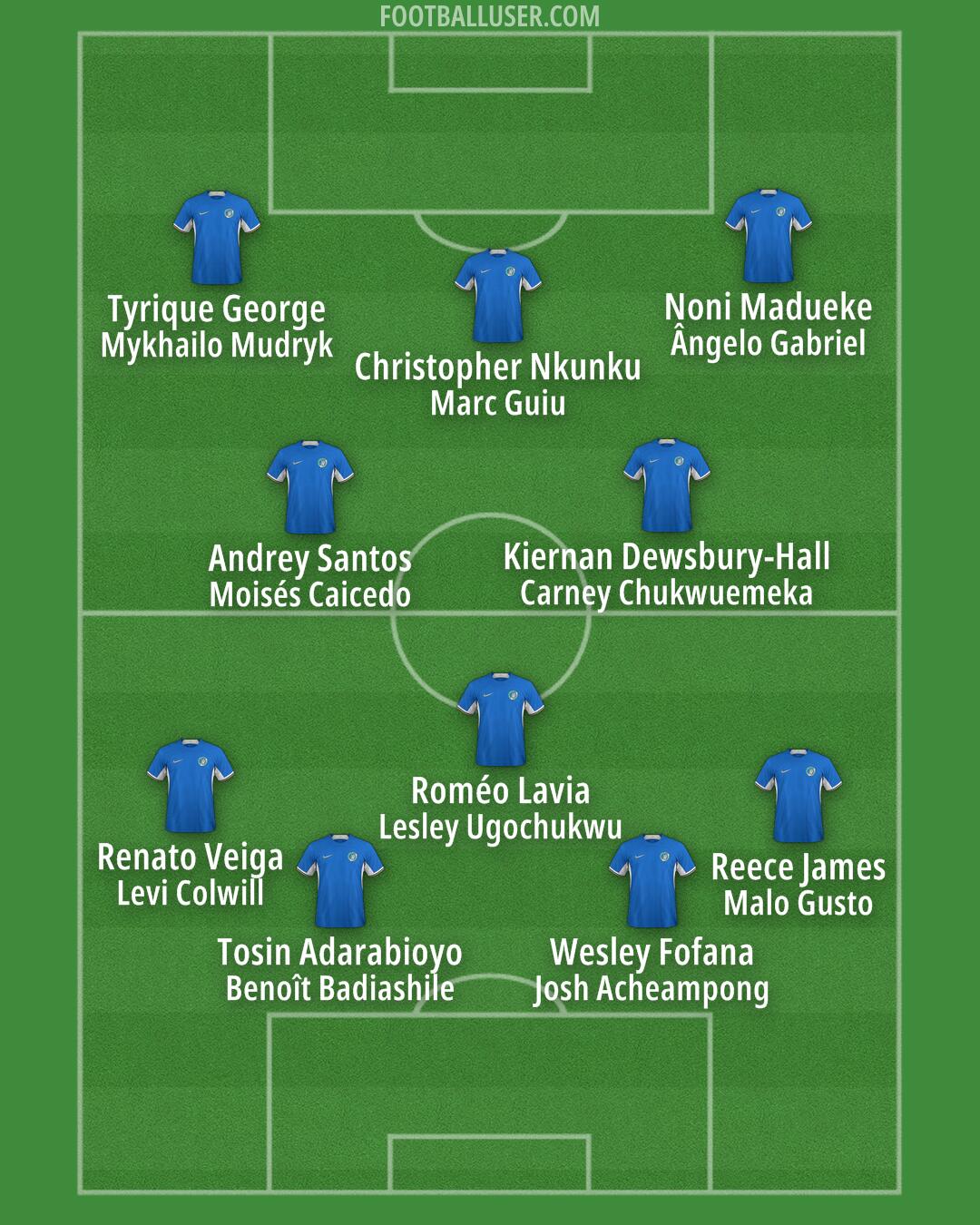 George (Nkunku) · Madueke · Neto · Palmer · Caicedo · Enzo · Cucurella · Tosin · Colwill · James · Jørgensen