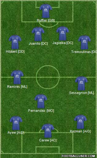 T. Howard · J. Heitinga · S. Distin · L. Hibbert · L. Baines · M. Fellaini · Coleman · Osman · M. Arteta · Saha · Cahill