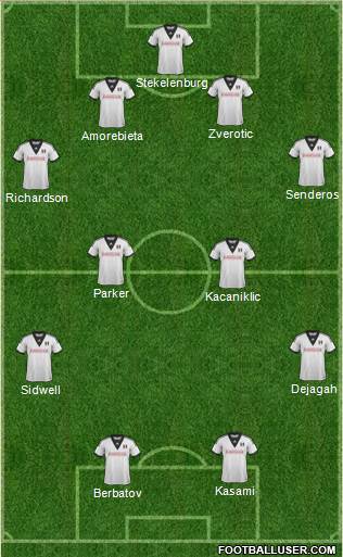 01. Stekelenburg · 35. Amorebieta · 05. Hangeland · 03. Riise · 27. Riether · 28. Parker · 07. Sidwell · 11. Kačaniklić · 16. Duff · 08. Kasami · 09. Berbatov