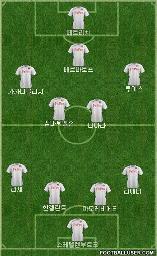Stockdale · Etheridge · Stekelenburg · Amorebieta · Senderos · Hughes · Hangeland · Briggs · Riether · Riise · Boateng · Sidwell · Richardson · Karagounis · Dejagah · Taarabt · Frei · Duff · Ruiz · Kačaniklić · Rodallega · Trotta · Berbatov · Bent